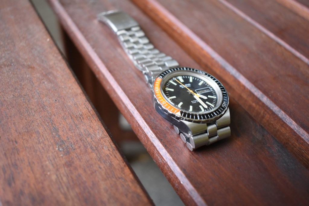 It was a bit tricky to get the automatic working smoothly because the ratcheting system is very delicate and the oiling needs to be just right. It also has a unique quick date function. You need to pull the crown past the second position and it engages a lever and a spring that pushes the date wheel around with a “snap”. This mechanism is useful but very finicky. I had to adjust the spring to have just the right amount of tension to only change one day at a time, and not jump 2 days ahead. This watch has an integrated bracelet. Not so useful for a functioning dive watch. Though this watch has a devil’s dial (666 feet depth rating), this isn’t a certified dive watch. No screw down crown being the tell tale sign. I thought the case and the bracelet melded together very nicely. I gave it a nice fresh polish and re-applied the brushed finish and it turned out nicely. The bakelite bezel is in great shape. These really maintain their sharp colors. Often these bezels are damaged because it is just a hardened plastic. People often ask me when I wear this watch if it’s a Seiko SKX. I guess that makes sense. Dive watches have a certain look that can make them hard to distinguish, especially at a distance. I think this looks more like a Squalematic.